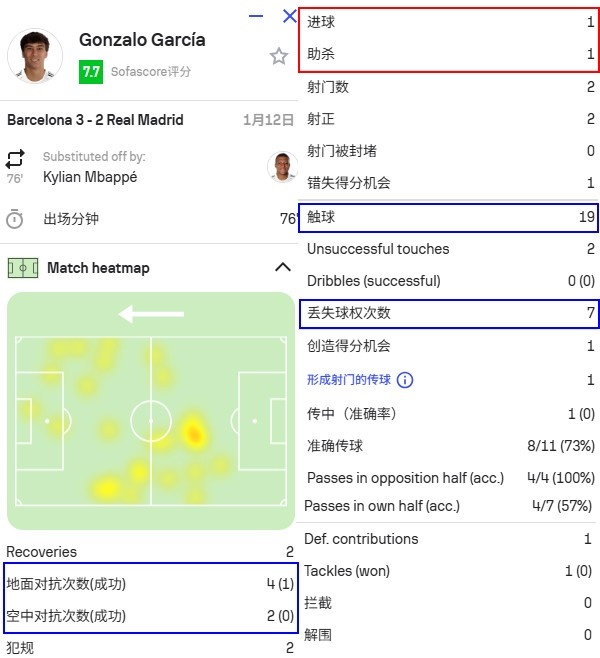 与巴萨的西超杯决赛上,贡萨洛6次一对一对抗输了5次,仅仅只有19次触球就丢球权7次,这样的数据也充分说明了他的问题。